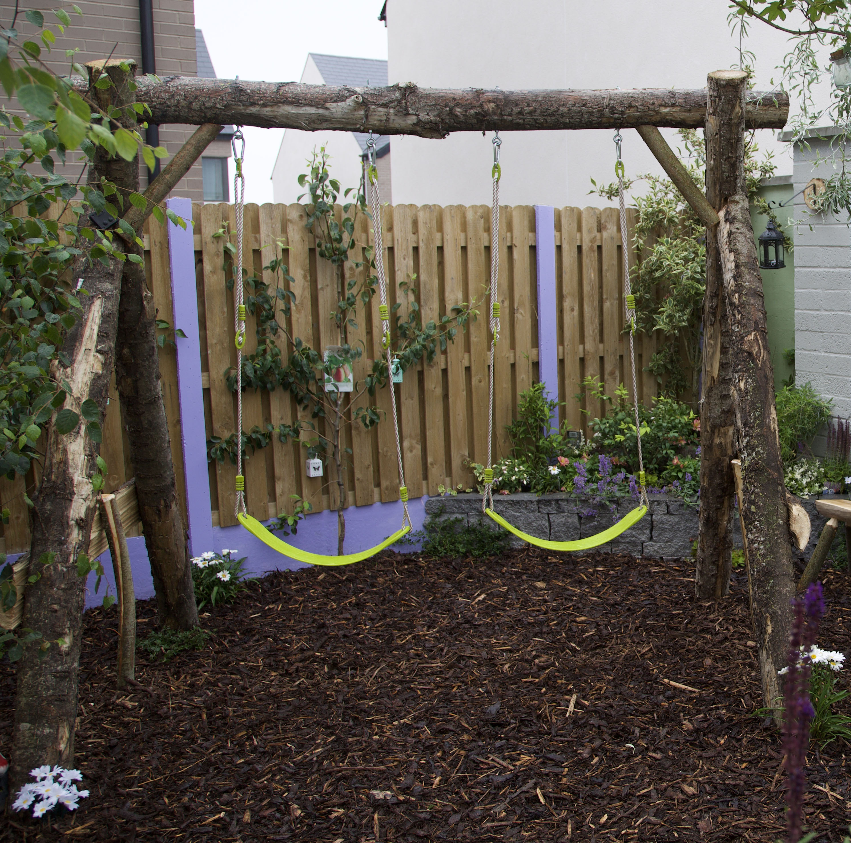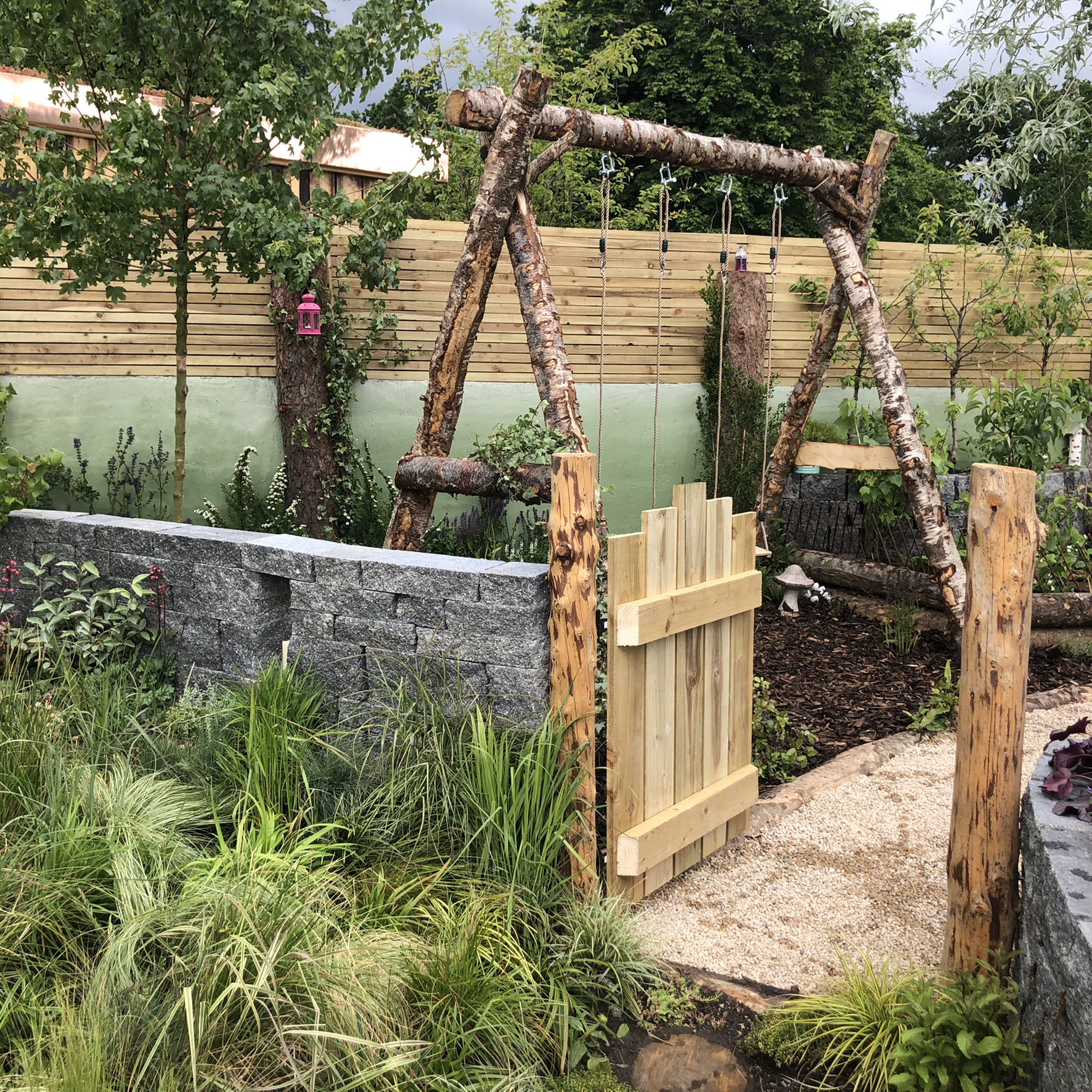 Pictured are a table and benches; A log ‘sofa’; Planted log bench and natural log swing.
